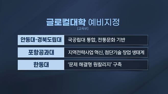 17개 대학이 도전장을 낸 대구·경북에서는 공동 신청한 안동대와 경북도립대, 단독 신청한 포항공대, 한동대 등 경북지역 3개 대학만이 선정됐습니다.