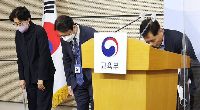 | ▲ 지난 2022년 12월 8일 오전 이규민 한국교육과정평가원장(가운데)과 박정 대학수학능력시험 채점위원장(왼쪽), 문영주 수능본부장이 세종시 정부세종청사에서 열린 2023학년도 대학수학능력시험 채점 결과 브리핑을 마친 뒤 인사하고 있다. |