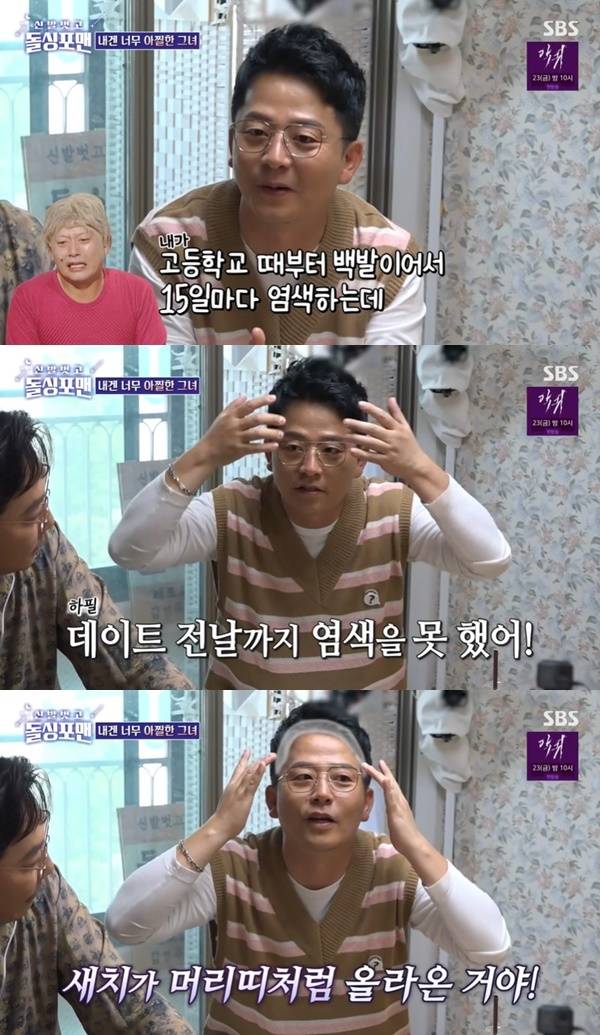 이어 김준호는 “고등학교 때부터 백발이었다. 15일마다 검은색으로 염색을 한다. 지민이 만나기 전에 염색을 하는데 못했다. 15일이 돼서 새치가 머리띠처럼 올라와 있었다. 그랬더니 술 먹다가 ‘뭐야? 오빠 새치대가리네?’ 일단 창피했다”고 털어놨다.
