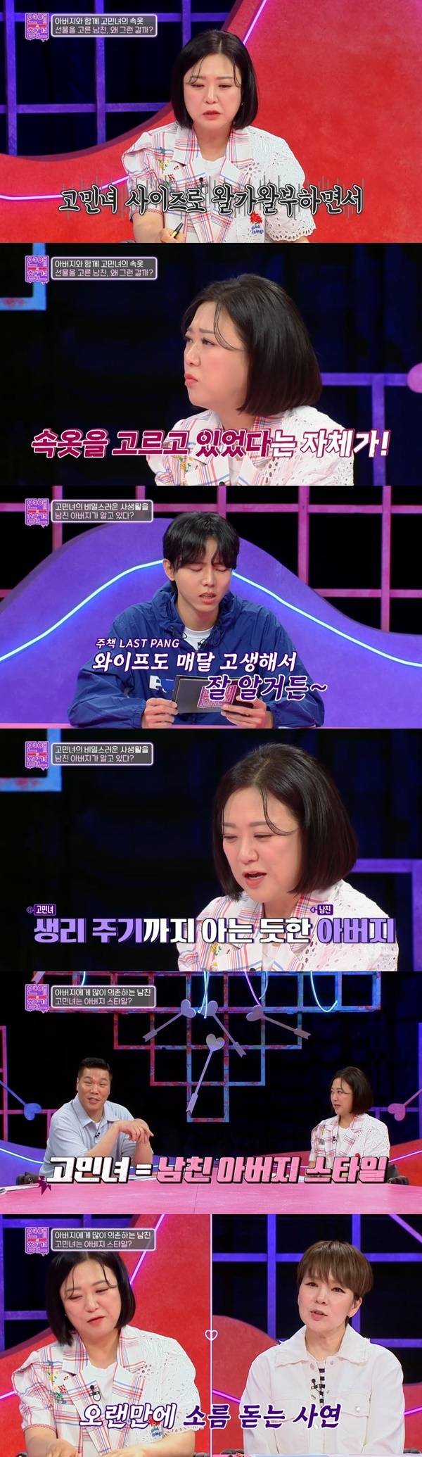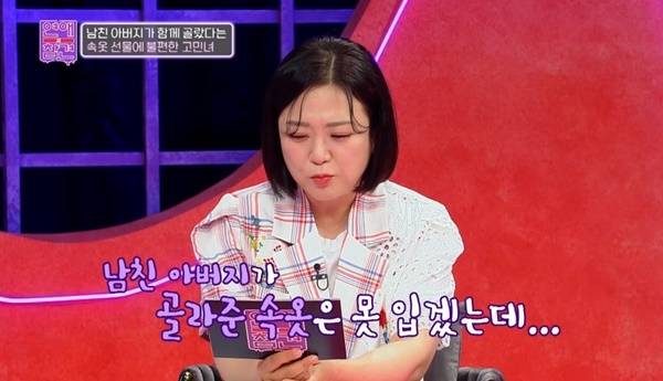 고민녀는 가장 당황스러웠던 대목은 남친이 준 선물이 속옷이었다는 것. 고민녀는 “남친 아버지가 골라준 속옷은 도저히 못 입겠다. 이런 제가 이상한 거냐”고 물었고 게스트 허웅은 “선을 지켜야 하지 않나. 아버지 카드를 쓴다는 것부터 잘못인 것 같다. 능력이 안 되면 가면 안 된다. 아버지 문제도 있는데 아들이 제일 문제인 것 같다”고 의견을 냈다.