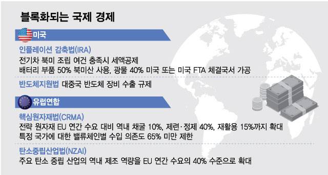이 과정에서 '세계의 공장'이라 불리던 중국은 철저히 배제됐다. 미국은 IRA를 통해 배터리 등 핵심 부품의 원자재도 중국 등 미국의 적성국이 아닌 곳에서 확보해야 한다고 명시했다. CRMA 역시 중국 의존도가 90%에 달하는 희토류 등 원자재 공급망을 재편하려는 시도다. 미국 정계는 중국에서 퇴출당한 미국 반도체기업 마이크론의 공백을 삼성전자가 대체하지 말라고 요청하기도 했다. 중국 사업을 유지하는 기업·국가에 대한 서방의 견제가 거세지고 있는 것이다.