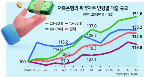 청년층 다음으로는 60~70대 취약차주의 저축은행 대출규모도 급증했다. 노년층의 취약차주 대출 증가율은 36.2%로 전체 증가율(32.5%)을 웃돌았다.
