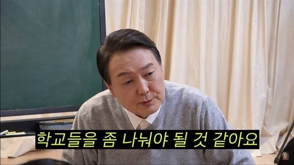 | ▲ 2022년 2월 윤석열 국민의힘 대선후보가 유튜브 "공부왕 찐천재"에 출연해 교육의 다양성을 위해 고등학교부터는 기술고, 예고, 과학고 등으로 나누자고 발언하는 장면 |