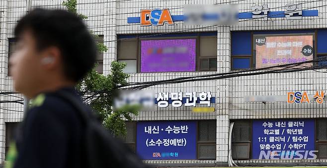 [서울=뉴시스] 김선웅 기자 = 5개월 앞으로 다가온 24학년도 수능에 빨간불이 켜졌다. 윤석열 대통령은 '킬러 문항'으로 불리는 초고난도 문항을 출제하지 않겠다며 수능 출제 방향에 직접 개입했으며 수능 출제를 주관하는 한국교육과정평가원장도 사퇴하면서 수험생과 학부모, 교육계가 혼란에 빠진 모습이다. 21일 서울 강남구 대치동 학원가의 모습. 2023.06.21. mangusta@newsis.com