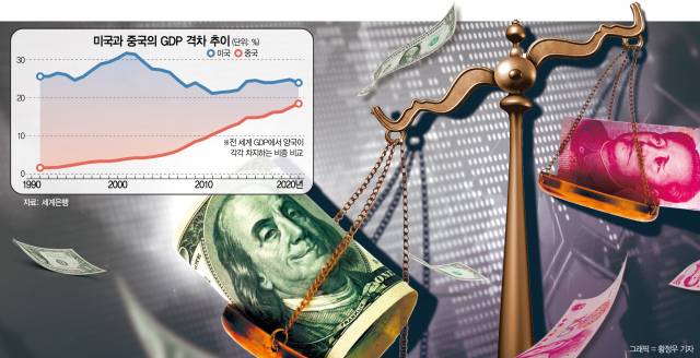 1992년 세계은행은 세계 경제 패권 변화를 예측한 충격적인 보고서를 내놓았다. 중국이 1970년대 말 경제 개혁을 실시한 후 연평균 9.5%의 성장률을 지속하면서 2020년 안에 미국의 GDP를 따라잡아 세계 1위의 경제 대국에 오를 것이라는 전망이었다. 공신력 있는 국제기관의 보고서에서 중국의 미국 추월을 예고한 것은 처음이었다. 중국은 2001년 세계무역기구(WTO) 정식 회원국에 가입한 후 이탈리아·프랑스·영국·독일을 차례로 제친 데 이어 2010년에는 일본을 넘어 세계 2위에 올랐다. 당시만 해도 중국이 미국을 추월해 세계 최대 강국으로 올라서는 것은 시간 문제였다. 두 나라가 전 세계 GDP에서 차지하는 비중은 1990년대 초반 20%포인트 이상의 격차를 드러냈지만 2021년에는 약 5.5%포인트 차로 좁혀졌다. 지난해 중국 GDP는 18조 1000억 달러로 미국의 25조 4600억 달러와 약 7조 3600억 달러의 격차를 보였다. 중국이 미국을 GDP에서 71%가량까지 따라잡은 셈이다. 미국과 중국의 GDP 순위 역전은 미국 주도의 세계 질서가 변화하는 상징적 사건으로 기록될 것이라는 전망도 쏟아졌다.