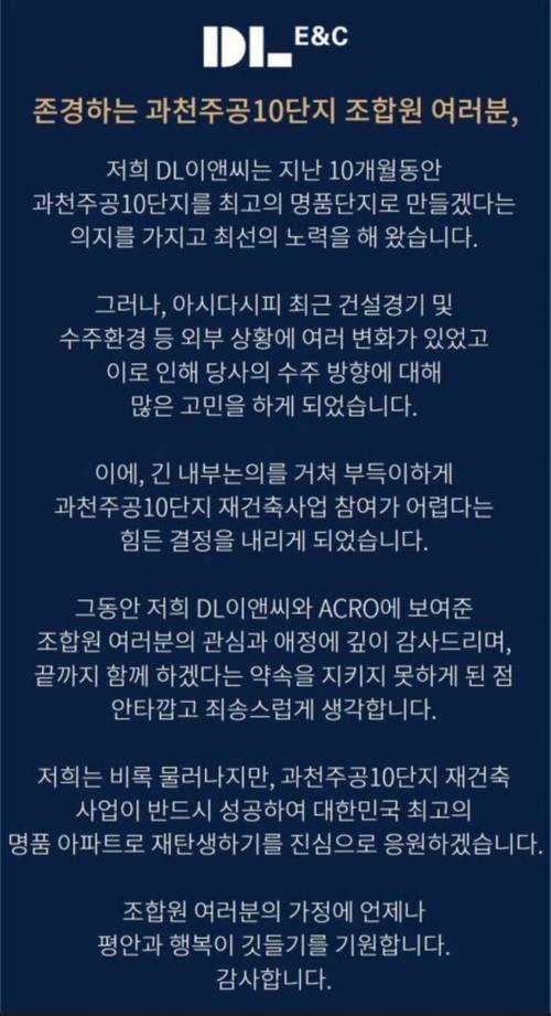 그러면서 “DL이앤씨와 아크로에 보여 준 조합원 여러분의 관심과 애정에 감사드리고, 끝까지 함께하겠다는 약속을 지키지 못하게 된 점 안타깝고 죄송스럽게 생각한다”며 “과천주공10단지 재건축사업이 반드시 성공해 명품 아파트로 재탄생하기를 진심으로 응원하겠다”고 고개를 숙였다.
