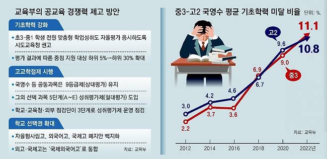 내년부터 전국 모든 초3, 중1 학생들을 ‘책임교육학년’으로 지정하고 학력 진단 시험을 치르도록 하는 방안을 교육부가 추진한다. 학력 저하로 위기에 처한 공교육을 강화하기 위해서다. 고교 학생들이 수업을 골라 들을 수 있는 ‘고교학점제’는 2025학년도부터 전면 시행된다. 이전 정부에서 폐지를 추진했던 자율형사립고(자사고), 외국어고, 국제고는 존치시킨다.