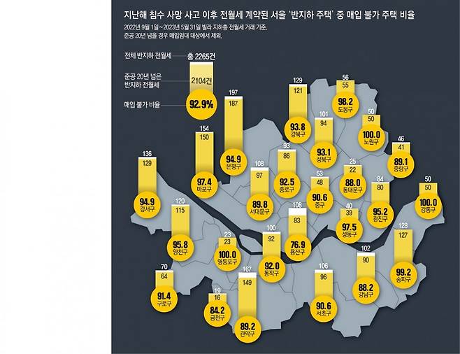 특히 이 기간 반지하 빌라 계약의 92.9%에 달하는 2104채는 2003년 이전에 지어져 준공 20년이 넘은 것으로 확인됐다. 현재 세입자들이 거주하고 있는 반지하 빌라 대부분은 지은 지 20년이 넘었다는 의미다.