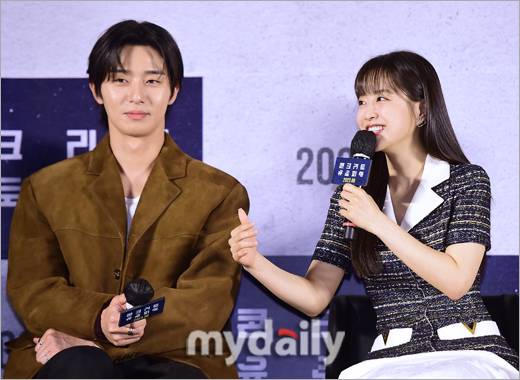 [마이데일리 = 김정수 기자] 21일 오전 서울 광진구 롯데시네마 건대입구에서 진행된 영화 '콘크리트 유토피아' 제작보고회에 참석한 배우 박보영이 박서준과의 첫 촬영이 웨딩 촬영 장면이었다고 밝혔다.