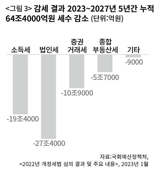 국회예산정책처는 2023년부터 2027년까지 5년간 누적 64조4000억원(연평균 12조8000억원)만큼 세수가 감소하리라고 추정했다. 세목별로 보면 법인세가 27조4000억원, 소득세가 19조4000억원, 증권거래세가 10조9000억원, 종합부동산세가 5조7000억원 등이다(〈그림 3〉 참조). 윤석열 정부는 법인세를 깎아주면 단기적으로는 세수가 줄어들지만 장기적으로 기업이 생산이나 고용 등에 재투자하고 그 결과 경제가 성장해 세수가 늘어난다는 논리를 폈다.