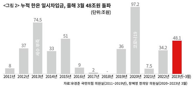 정부가 이미 재정 운용에 상당한 어려움을 겪고 있음을 단적으로 보여주는 수치가 있다. 올해 들어 3월까지 정부가 한국은행(한은)에서 빌린 금액이 48조1000억원을 넘어섰다(〈그림 2〉 참조). 이 중 17조1000억원은 상환했으므로 대출 잔액은 3월 말 기준 31조원이다(장혜영 정의당 의원실). 물론 정부는 일시적으로 세금이 덜 들어왔을 때 한은에서 단기로 돈을 빌려 자금을 융통할 수 있다. 나중에 세금이 들어오면 갚으면 된다. 그러나 지난해 일시차입금이 모두 34조2000억원이었고 2021년에는 7조5000억원이었음을 고려하면, 불과 3월 시점에 48조원을 넘어선 것은 이례적이다. 우석진 명지대 경제학과 교수는 “코로나19만큼의 충격이 없는데도 벌써 30조원 넘게 한은 돈을 빌려야 한다는 건 그만큼 재정 운용에 문제가 생겼다는 의미다. 금방 갚기 때문에 물가에 당장 영향을 주진 않지만, 누적되면 시중에 돈이 풀린 것과 마찬가지 효과라서 통화정책에도 부담이 될 수 있다”라고 말했다.