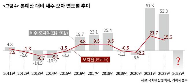기재부의 세수 추계 실패는 처음이 아니다. 2021년에는 61조3000억원, 2022년 53조3000억원 세수 오차를 냈다(〈그림 4〉 참조). 당시에는 예상보다 세금이 ‘더’ 걷혀서 문제였다. 이번에는 역대급으로 ‘덜’ 걷힐 전망이다. 기재부는 2022년 2월 세수 오차 개선 대책을 내놓았다. “8월 세입예산안 편성 후 11월 국회심의 과정에서 경제위기 등으로 세입예산안과 (실제 세수 전망의) 차이가 상당히 큰 경우 재추계”한다는 내용을 담았다. 하지만 경제성장률을 지난해 6월 2.5%에서 12월 1.6%로 낮춰 전망했으면서도 재추계를 하지 않았다. 감세 기조를 가져가려고 재추계를 하지 않은 것 아니냐는 의심까지 나온다.