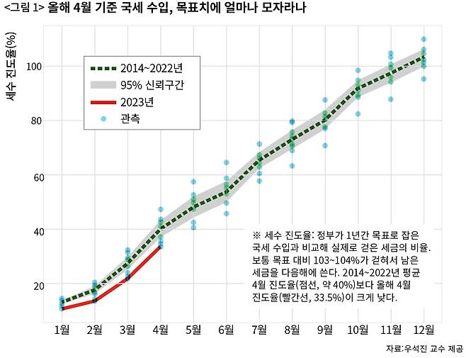 세금이 안 걷히고 있다. 정부가 1년간 목표로 잡은 국세 수입과 비교해 실제로 걷은 세금의 비율을 뜻하는 ‘진도율’은 올해 4월 기준 33.5%다. 지난해 같은 기간(42.4%)은 물론이고 2014년에서 2022년까지 8년간의 평균 4월 진도율(약 40%)에 크게 못 미친다(〈그림 1〉 참조). 올해 1~4월 걷힌 국세는 134조원으로 지난해 같은 기간 대비 33조9000억원이 덜 들어왔다.