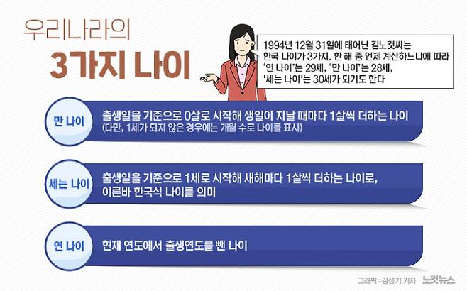 ◇ 김현정> 우리나라에는 세 개의 나이가 존재해 왔습니다. 한국 나이, 만 나이, 연 나이. 일단 그 차이점부터 좀 우리가 알고 들어가야지 이해가 쉬울 것 같아요.
