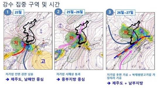 26~27일에는 다시 제주와 남부지방을 중심으로 비가 오겠다. 이때 정체전선상 저기압 뒤편에서 부는 바람과 북태평양고기압 가장자리를 타고 부는 바람이 합쳐지면서 비가 꽤 많이 내릴 수 있겠다.