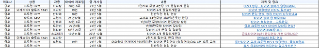 특히 SUV 전용 고급 상품인 ‘크루젠 HP71’ 결함 주장 빈도수가 가장 높았다. 지난 2021년 5월부터 차주들의 문제제기가 시작됐던 이 제품은 6월 현재까지 3년 넘게 같은 현상을 호소하는 글이 게재되고 있다. 크루젠 HP71의 경우 2017년 3월 출시된 금호타이어 인기 제품 중 하나다. 세단용인 마제스티9 솔루스 TA91과 솔루스 TA5에서도 동일 문제가 나왔다.