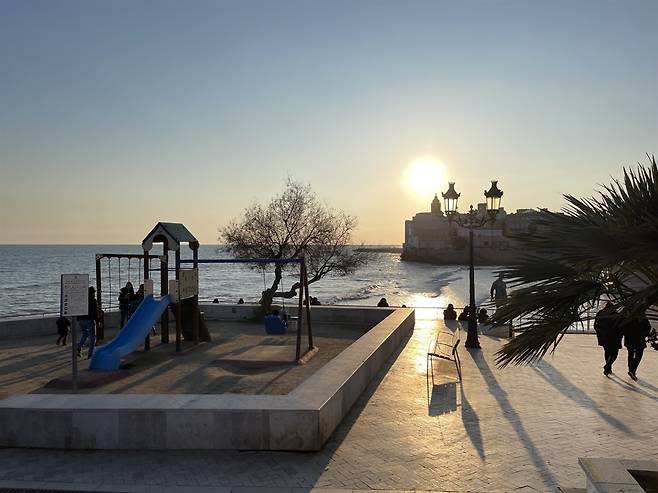 | ▲ 지중해의 겨울 바다 시체스 해변의 놀이터에서 |