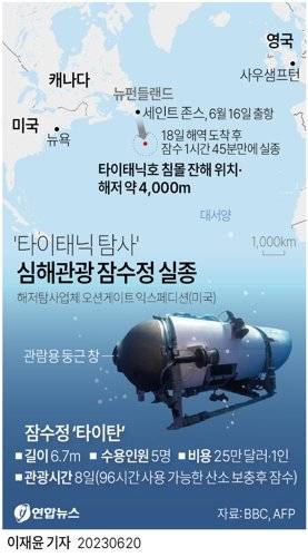 타이탄은 지난 16일 캐나다 최동단 뉴펀들랜드 래보라도주 세인트존스에서 출항해, 18일 오전 미국 매사추세츠주 케이프코드 해안에서 약 900마일(1450㎞) 떨어진 지점에 도착한 뒤 잠수를 시작했다. 이후 1시간45분 만에 통신이 두절돼 아직까지 행방이 묘연한 상태다. 여행비는 1인당 25만 달러(약 3억4000만 원)로 ‘초호화 익스트림 관광상품’이란 비판도 있었다.