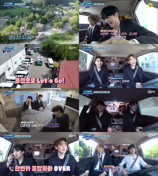 이들은 촬영을 마치고 첫번째 캠핑장으로 강원도 홍천 살둔 마을로 향했다. 한빈카, 태래카로 나눠 자연스럽게 나눠진 제로베이스원은 본격적인 여행에 설레어하는 모습을 보이기도. 김태래가 운전하는 ‘태래카’는 박건욱, 장하오, 김지웅, 한유진이 탑승했고, 성한빈이 운전하는 ‘한빈카’는 석매튜, 리키, 김규빈이 탔다.