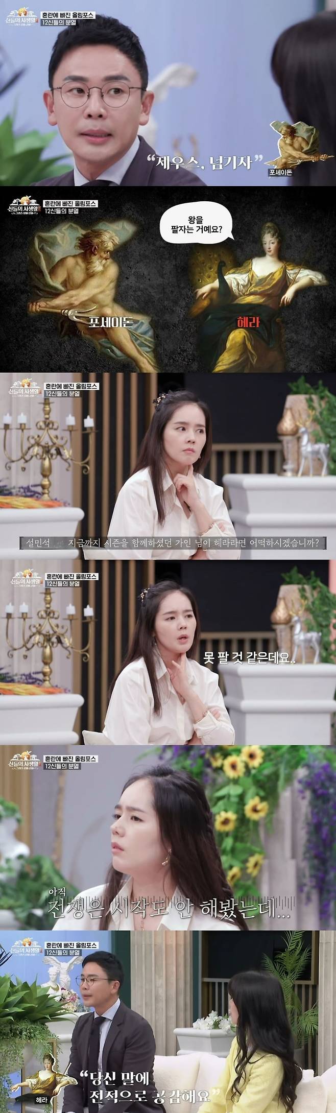 설민석은 "당신 말에 전적으로 공감한다. 그런데 가이아가 우릴 가만둘까요? 한 번 배신한 사람은 또 배신한다. 우리는 이용하다가 감옥에 갇혀버릴 거다"라며 포세이돈의 제안을 거절한 헤라에 대해 말했다.