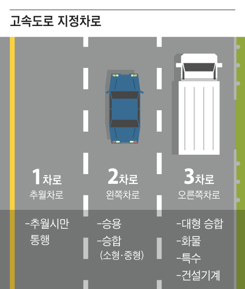 현행법상 고속도로 운행 차량은 차종에 따라 소형차는 왼쪽 차로, 대형차는 오른쪽 차로로 주행해야 한다. 또한 1차로는 앞선 차량을 앞지를 때만 이용해야 한다. 차가 막히는 등 도로상황으로 인해 시속 80㎞ 미만으로 갈 수밖에 없는 경우에 한해서만 앞지르기를 하지 않더라도 계속 주행이 가능하다.