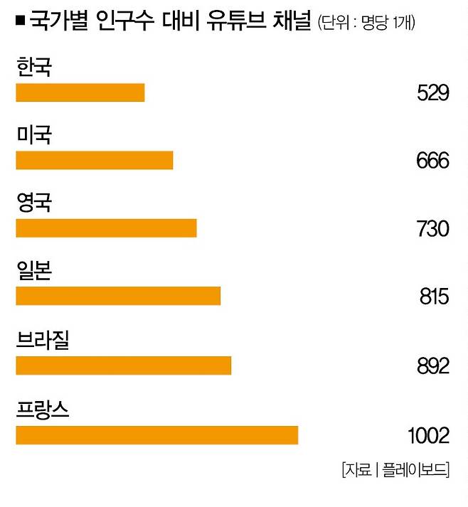 유튜버를 비롯해 콘텐츠를 기반으로 개인이 수익을 창출하는 생태계인 '크리에이터 이코노미' 산업 역시 커지고 있다. 유튜브 분석업체 플레이보드의 통계를 보면, 2020년 말 기준 국내에서 광고 수익을 창출하는 유튜브 채널은 총 9만7934개다. 이를 우리나라 총인구수(5180만명)로 나누면 국민 529명당 1명이 유튜버를 하고 있다는 얘기다. 이는 '유튜브 종주국' 미국을 능가하는 수치다. 미국의 경우, 국민 666명당 1명이 유튜브 채널을 갖고 있다.