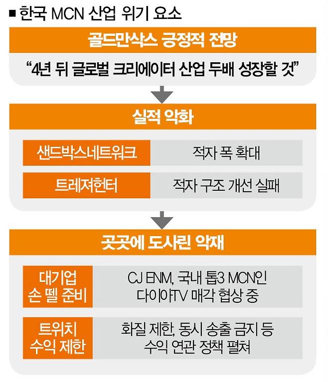 "4년 뒤 글로벌 크리에이터 산업은 4800억 달러(약 611조원) 규모로 성장할 것이다." 미국 글로벌 투자은행 골드만삭스는 이렇게 전망했다. 유튜브, 트위치, 틱톡, 인스타그램 같은 플랫폼에서 활약하는 크리에이터와 이들에게 열광하는 팬들이 더 늘어날 거란 낙관적 전망이다. 아이러니하게도 4년 뒤엔 이들 크리에이터를 관리하는 MCN 산업의 전망은 불투명하다. 이유가 뭘까.