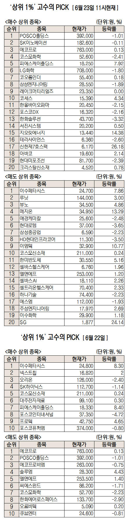 미래에셋증권에서 거래하는 고수익 투자자들이 23일 오전 가장 많이 순매수한 종목은 포스코홀딩스(POSCO홀딩스(005490))로 나타났다. SK이노베이션(096770), 에코프로(086520), 코스모화학(005420) 등도 순위에 올랐다.