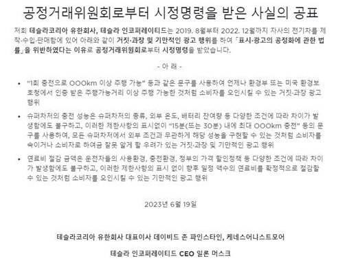 공표내용은 “2019년 8월부터 2022년 12월까지 자사의 전기차를 제작·수입·판매함에 있어 거짓·과장 및 기만적인 광고행위를 해 표시·광고의 공정화에 관한 법률을 위반하였다는 이유로 공정거래위원회로부터 시정명령을 받았다"는 것이다.