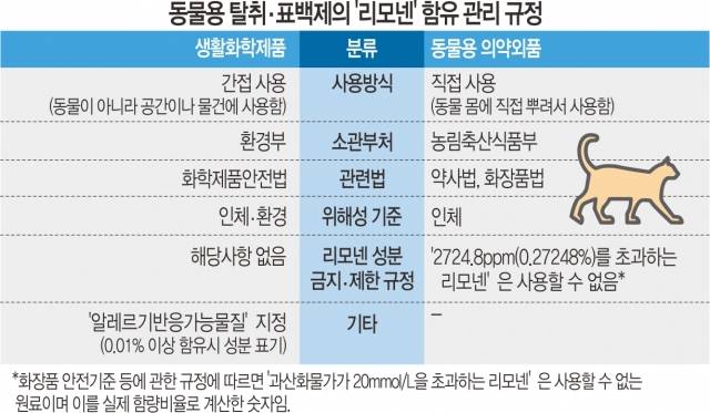 이와 달리 반려동물 주변과 물건에 사용하는(간접사용) ‘동물용 탈취·표백제’의 경우 리모넨은 ‘탈취·표백제 내 함유금지·함량제한물질’에 해당하지 않는다. 대신 알레르기반응가능물질로 지정돼 0.01% 이상 함유한 제품에 성분 명칭만 표기하도록 규정하고 있다. 환경부가 소관 부처이고, 관련 규정을 담은 화학제품 안전법도 동물이 아닌 ‘인체·환경 위해성’을 안전성 기준으로 삼고 있다. 이하린 호주 퀸즐랜드 병리학연구소 생화학 연구원은 국민일보와의 통화에서 “인체에 대한 안전성 기준을 모든 동물에 일방적으로 적용하는 것은 무리가 있어 보인다”며 “한국은 동물보호 관점의 화학물질 규제가 없는 상황”이라고 지적했다.