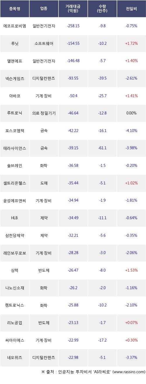 외국인 투자자의 순매도 상위 20개 종목은 에코프로비엠, 루닛, 엘앤에프, 넥슨게임즈, 아바코, 루트로닉, 포스코엠텍, 테라사이언스, 솔브레인, 셀트리온헬스케어등이다.