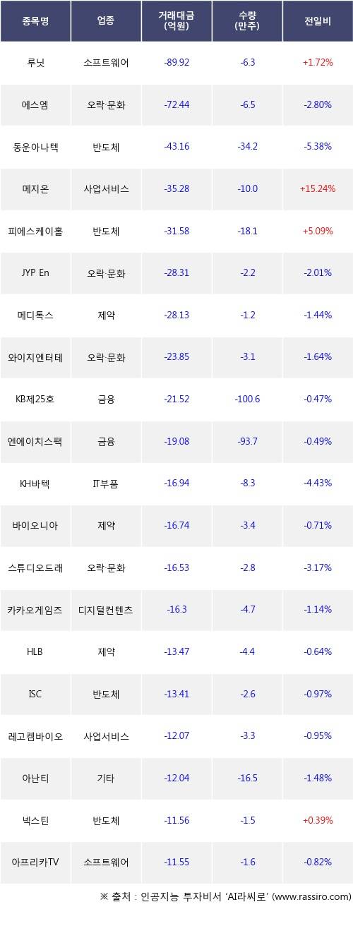 기관 투자자의 순매도 상위 20개 종목은 루닛, 에스엠, 동운아나텍, 메지온, 피에스케이홀딩스, JYP Ent., 메디톡스, 와이지엔터테인먼트, KB제25호스팩, 엔에이치스팩29호등이다.