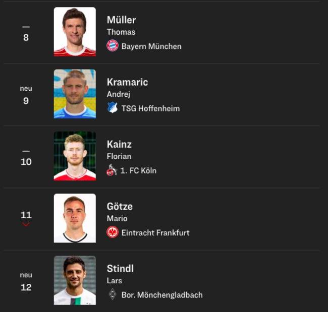 그 뒤를 이어 토마스 뮐러(바이에른 뮌헨)이 이름을 올렸고, 안드레이 크라마리치(호펜하임), 플로리안 카인츠(쾰른), 마리오 괴체(프랑크푸르트) 그리고 라스 슈틴들(보루시아 묀헨글라트바흐)가 포함됐다.
