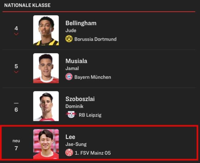 이재성은 7위에 이름을 올렸다.