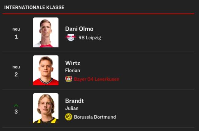 이재성은 7위에 이름을 올렸다. 가장 높은 점수를 받은 선수는 다니 올모(라이프치히)이며, 플로리안 비르츠(레버쿠젠), 율리안 브란트(도르트문트)가 각각 그 뒤를 이엇다. 주드 벨링엄(도르트문트→레알 마드리드)는 4위에 랭크됐다. 또한 바이에른 뮌헨의 분데스리가 우승을 결정지었던 자말 무시알라는 5위에 이름을 올렸다. 6위는 도미니크 소보슬러이(라이프치히)가 선정됐다. 이재성은 7위다.