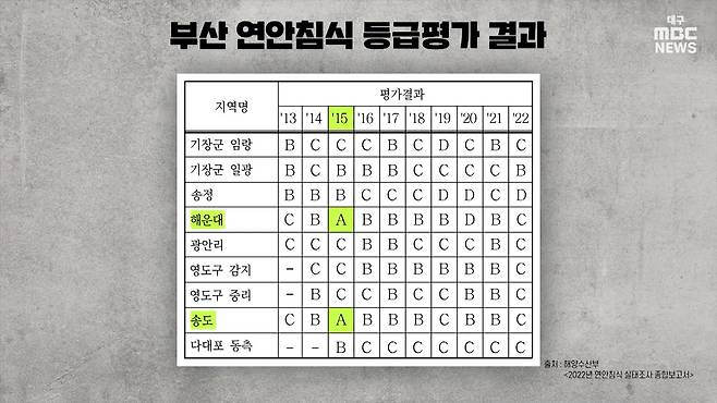반선호 부산시의원 "지난 10년 동안 A 등급을 받은 게 2015년 해운대와 송도해수욕장 단 두 곳이었는데요, 이때가 두 해수욕장에 모래를 대규모로 넣었을 때예요. 이렇게 모래를 많이 넣으니까 당시에는 A 등급을 받았는데요, 그런데 그 성적이 오래 가지 못했고 점점 안 좋아졌어요"