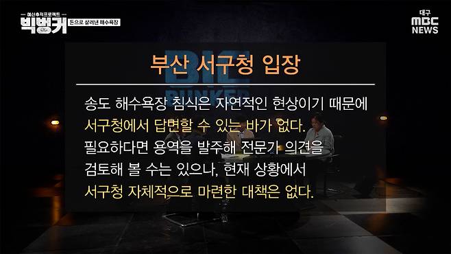 이에 대한 대책은 있을까요? 부산 서구청은 "해수욕장 침식은 자연적인 현상이기 때문에 서구청에서 답변할 수 있는 바가 없다. 필요하다면 용역을 발주해서 전문가 의견을 검토해 볼 수는 있으나 현재 상황에서 서구청 자체적으로 마련한 대책은 없다"는 입장입니다.