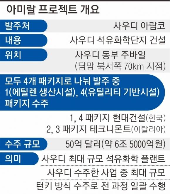 현대건설은 이 초대형 프로젝트 중 패키지 1과 4의 공사를 수행한다. 패키지 1은 아미랄 프로젝트의 핵심인 MFC(혼합 크래커)를 건설하는 공사로, 공정 부산물을 활용해 ‘화학산업의 쌀’이라 불리는 에틸렌을 연간 165만t 생산하는 설비다. 패키지 4는 고부가가치 화학물질을 생산하는 주요 인프라 외 기반설비, 탱크, 출하설비 등을 포함한 시설 건설 공사다. 패키지 2·3은 이탈리아의 테크니몬트사가 수주했다.