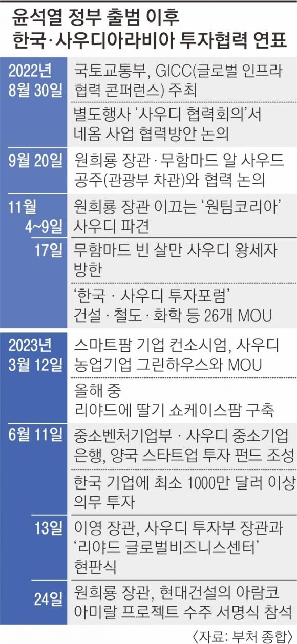 대통령실은 아울러 “지난해 11월 윤 대통령과 무함마드 빈살만 사우디 왕세자 겸 총리와의 정상회담에서 양국 관계를 미래지향적 전략 동반자 관계로 발전시키고 인프라 분야에서 대규모 경제 협력을 추진하기로 합의한 후 이뤄진 정상외교 성과”라고 의미를 부여했다.