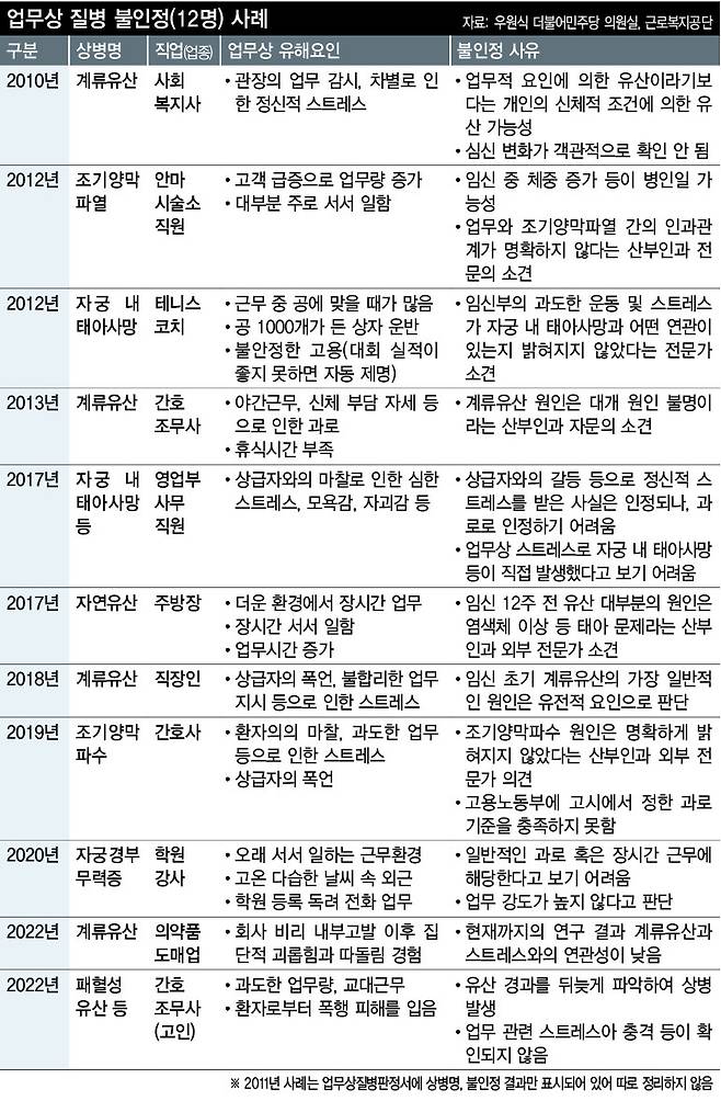 한 예로, 안마시술소에서 사무 및 고객 관리, 시술 후 침대 뒷정리 등의 업무를 담당했던 ㄴ씨는 ‘고객 급증으로 업무량이 늘고, 주로 서서 일해서 조산을 했다’며 산재를 신청했으나, 질병판정위는 “직업적 요인의 강도, 지속 시간과 조기 진통 유발에 대한 명확한 근거는 현재까지 없다”는 등의 이유로 산재를 인정하지 않았다.