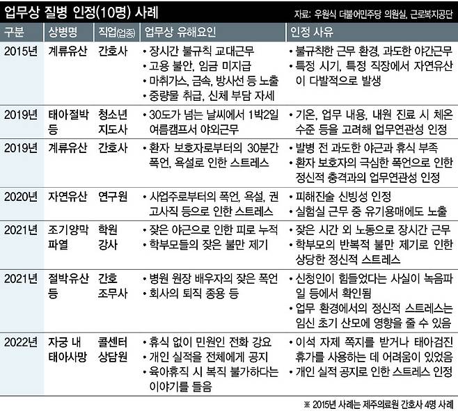 실제로 수도권 한 종합병원 응급실 간호사인 이아무개(30대)씨는 “응급실에서 환자를 이송하고, 쪼그려 앉아 주사를 놓거나 수액 팩 20개가 든 20㎏ 상자를 나르다 (임신 6주차에) 유산이 된 게 아닐까 생각했다”면서도 “이게 산재가 될 수 있다는 얘기는 들어보지 못했다”고 말했다.