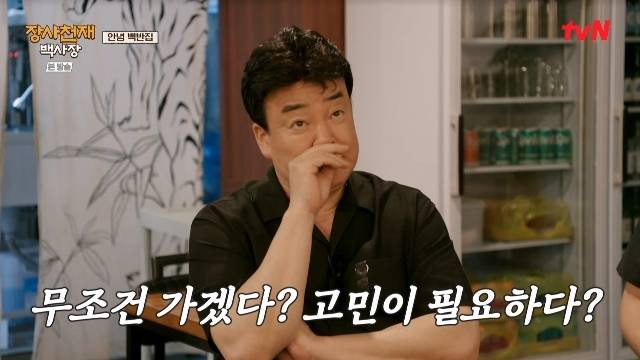 이에 목이 탄 백종원은 제작진에게 "안 간다고 하셨지만 만약에 어쩌다 간다면 무조건 가겠냐, 고민이 필요하냐"는 질문을 들었다. 제작진은 "나는"이라며 막 입을 연 백종원의 답변을 공개하지 않으며 시즌2의 가능성을 열어둬 시청자들의 눈길을 끌었다. (사진=tvN '장사천재 백사장' 캡처)
