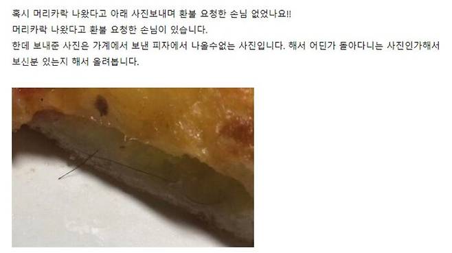 피자 가게를 운영하고 있는 작성자 A 씨는 "머리카락이 나왔다고 환불 요청한 손님이 있었다"며 피자 도우 가장자리에 머리카락이 박혀 있는 모습이 담긴 사진을 게시했습니다.