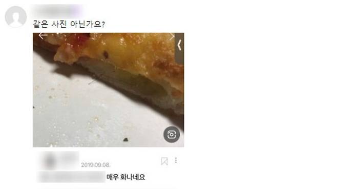 누리꾼이 공유한 개인 SNS 글에는 앞서 A 씨가 게시한 피자 모양과 머리카락이 박혀 있는 위치까지 동일한 사진이 게시되어 있었습니다.
