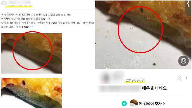 이어 A 씨는 "(손님이) 보내준 사진은 골드엣지고, (가게에서) 보낸 피자는 에그"라며 "피자는 회수했고, 머리카락 나온 부분은 휴지에 싸서 넣어두었다고 하는데 없다"라고 밝혔습니다.