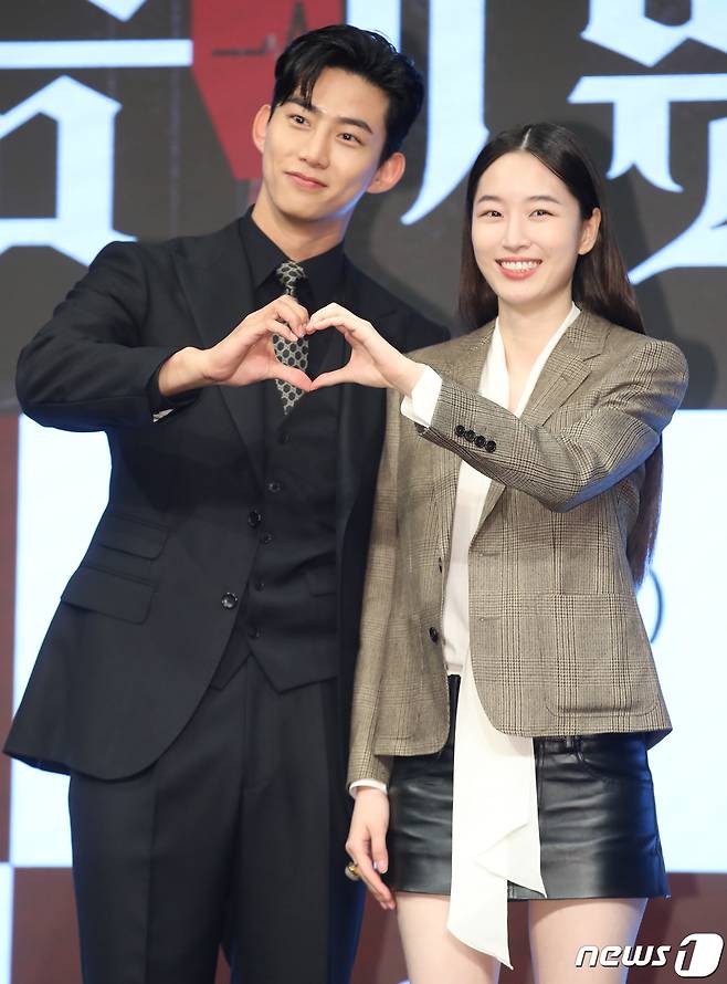 (서울=뉴스1) 권현진 기자 = 배우 옥택연과 원지안(오른쪽)이 26일 서울 구로구 더세인트에서 열린 KBS2 새 월화드라마 '가슴이 뛴다' 제작발표회에서 포즈를 취하고 있다.