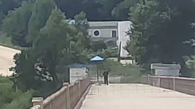 중국 소셜미디어에는 두만강 대교를 사이에 두고 중국 지린성 훈춘 통상 구역의 맞은편에 있는 북한 원정리 세관의 초소병이 방역복을 착용하지 않고 군복만 입은 채 근무 중인 사진이 올라왔습니다.