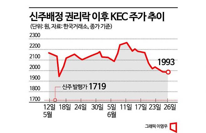 유상증자로 새로운 성장동력에 투자할 자금을 마련하면서 한숨 돌린 KEC와 달리 증자에 참여한 주주들은 신주 상장일까지 주가 흐름에 예민할 수밖에 없다.