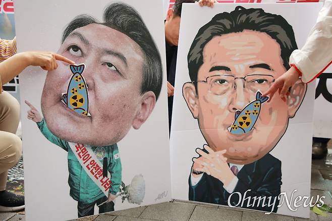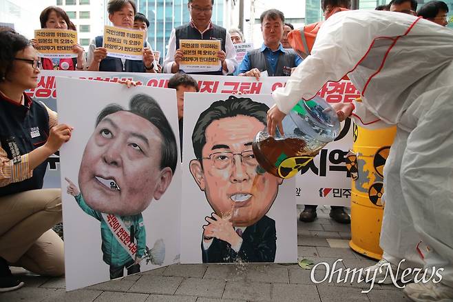 우리 정부의 대응과 일본 오염수 방류 초읽기에 성난 노동자들이 윤석열 대통령, 기시다 후미오 일본 총리의 얼굴에 오염수를 들이부었다. 세슘, 스트론튬 등 방사성 물질을 상징하는 거뭇한 물이 쏟아진 뒤엔 바로 '오염 물고기'까지 등장했다.
