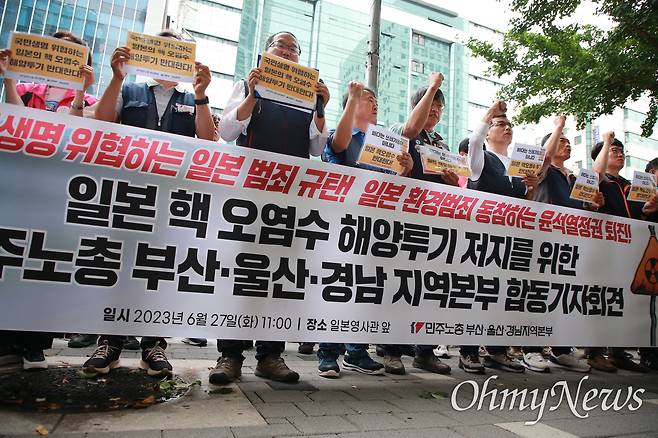 일본이 오염수 해저터널 공사를 완료하고, 우리 정부가 "가장 현실적 대안"이라는 설명까지 내놓자, 27일 낮 부산시 동구 주부산일본국총영사관 앞에서 펼쳐진 장면이다. 일본과 지리적으로 가까운 지역인 부산·울산·경남의 노동자들은 이날 부산으로 모여 함께 대응에 나섰다.
